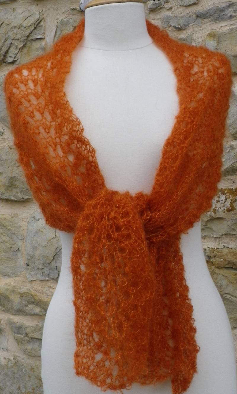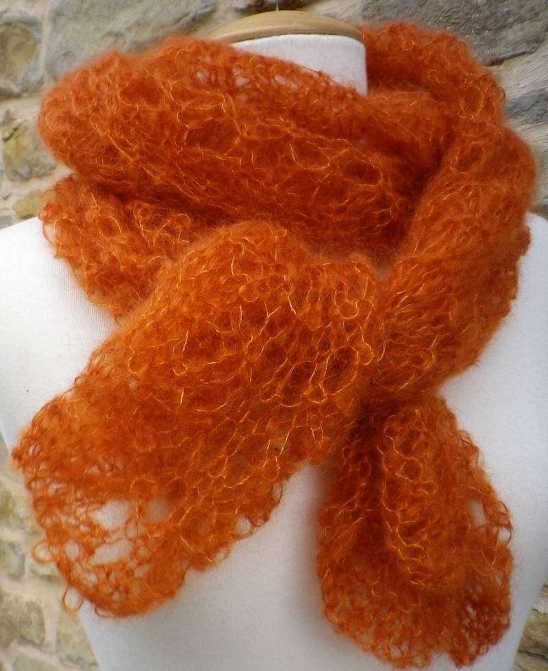 Cette écharpe est tricotée à la main avec notre fil à tricoter pur Mohair( 80 %) et Soie naturelle (20 %).